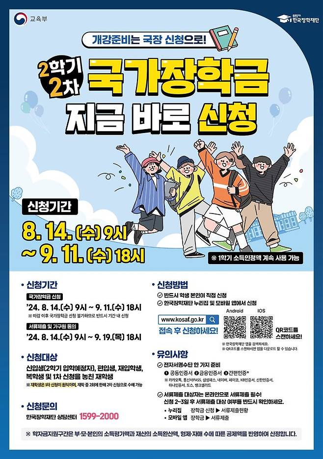 국가장학금 2차 신청이 곧 시작됩니다. 이번 신청은 2024학년도 2학기 등록금을 지원받고자 하는 학생들에게 마지막 기회로, 기간 내 반드시 신청을 완료해야 합니다. 아래에서 신청 대상자, 신청 방법, 신청 기간, 장학금 종류 및 유의사항에 대해 자세히 안내해 드리겠습니다.
